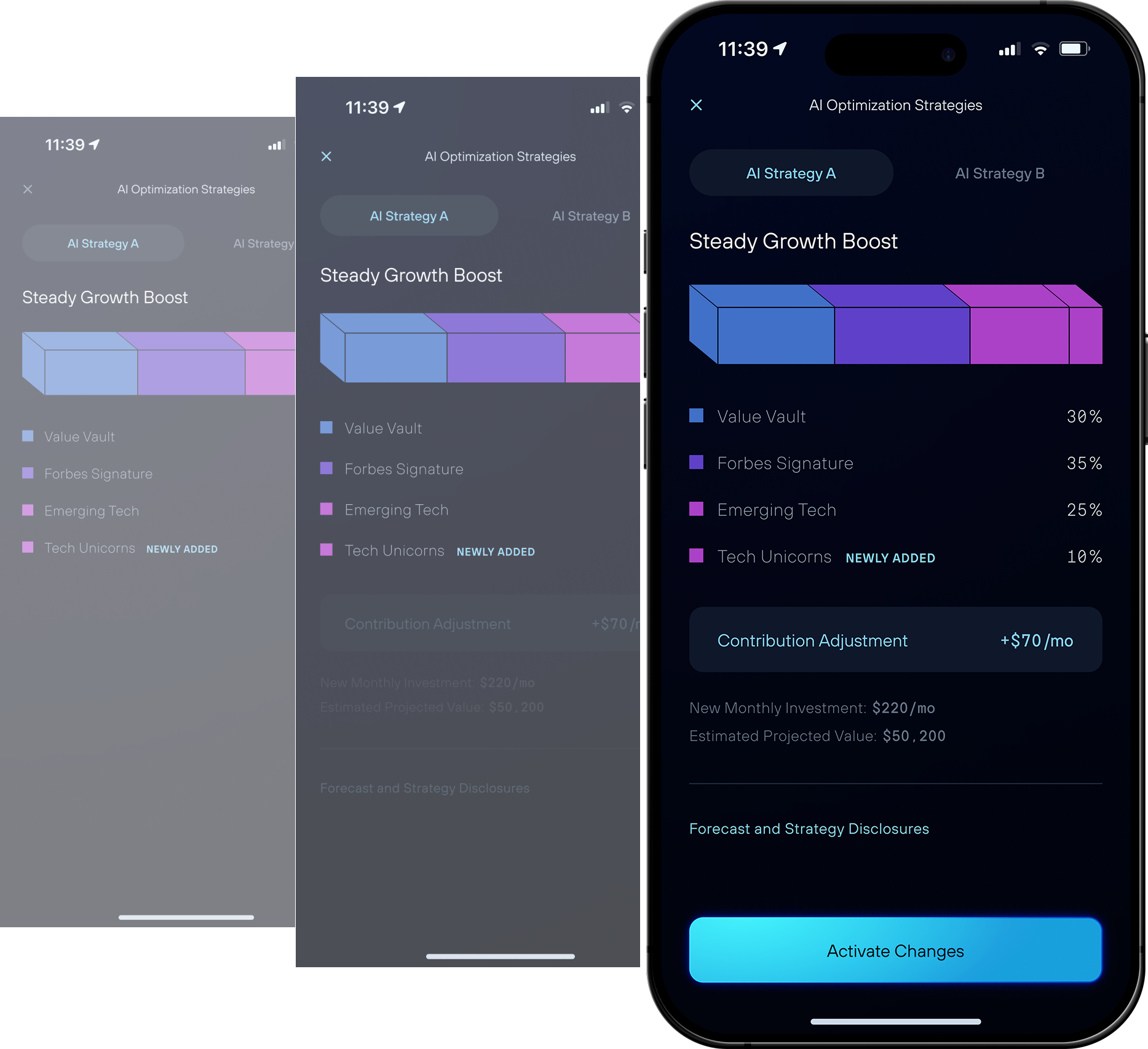 One-tap portfolio addition eliminated trading complexity. No order types, no share calculations. Just "Add to AI Portfolio" and the system handled everything—rebalancing, allocation, integration. Users weren't buying stocks; they were funding their future.
